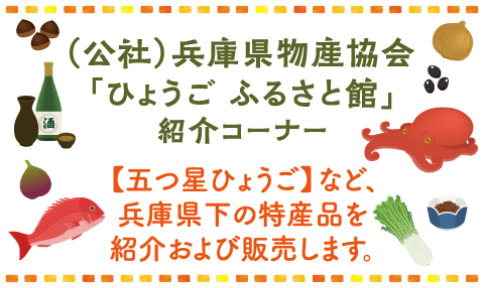 兵庫県物産協会直営の店舗「ひょうごふるさと館」紹介コーナーにて、摂津(神戸・阪神)・播磨・但馬・丹波・淡路の「ひょうご五国」の特産品を取り揃えて展示、販売を行います。